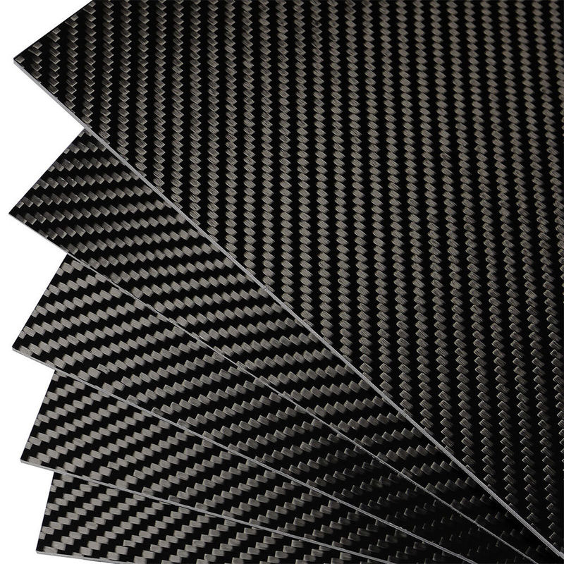 These high-quality carbon fiber sheet plates come in various sizes, made from 100% 3K plain weave carbon fiber and finished with a matt surface on both sides. Unlike many low-cost carbon sheets that are made by pressing two outer skins of carbon fiber over a carbon and resin core, these plates are made with layered sheets of carbon fiber and resin, making them the same strength all the way through.